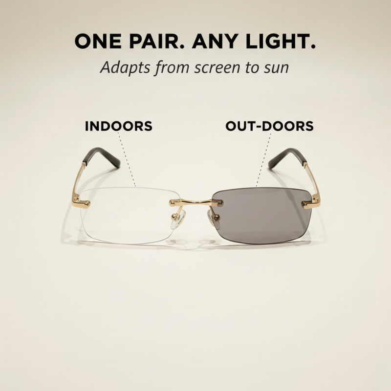 The secret is Lucent™'s photochromic lens technology — the same adaptive response used in premium prescription eyewear — combined with 97% blue light filtration and full UV400 protection, all housed in a featherlight rimless metal frame that feels like wearing nothing at all.