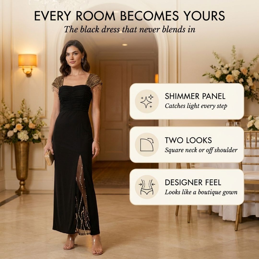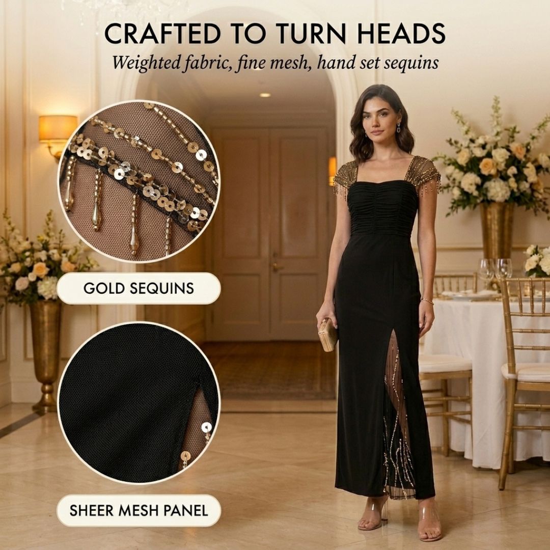 Most black dresses just hang there. This one comes alive with every step — catching light like a shower of gold.