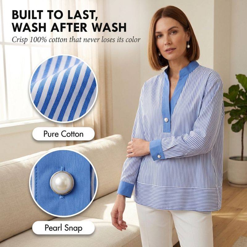 ✔ COLORS THAT STAY VIBRANT WASH AFTER WASH — The bold stripe print on the Pearlwick™ is woven into 100% cotton fabric that holds its color. Wash it, wear it again. No fading. No surprises. Just a blouse that looks brand new every time.