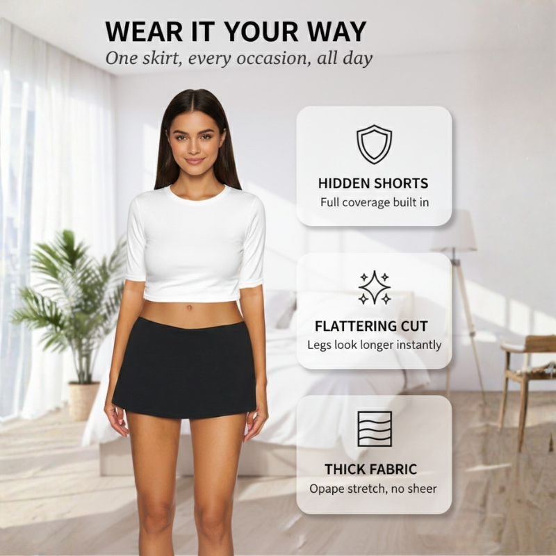 This is the only micro skirt you'll reach for again and again — for date nights, brunches, nights out, or any moment you want to feel undeniably confident. The structured A-line cut hugs your waist while the flared hem creates that effortless silhouette that elongates your legs and flatters every curve — and the built-in comfort shorts mean you move freely, sit boldly, and never think twice.