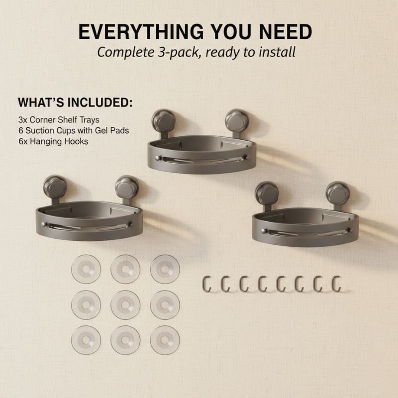 Package Includes: 3-pack of 3-tier triangular corner caddies with suction cups and hooks